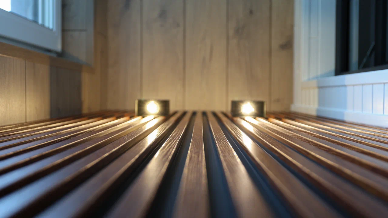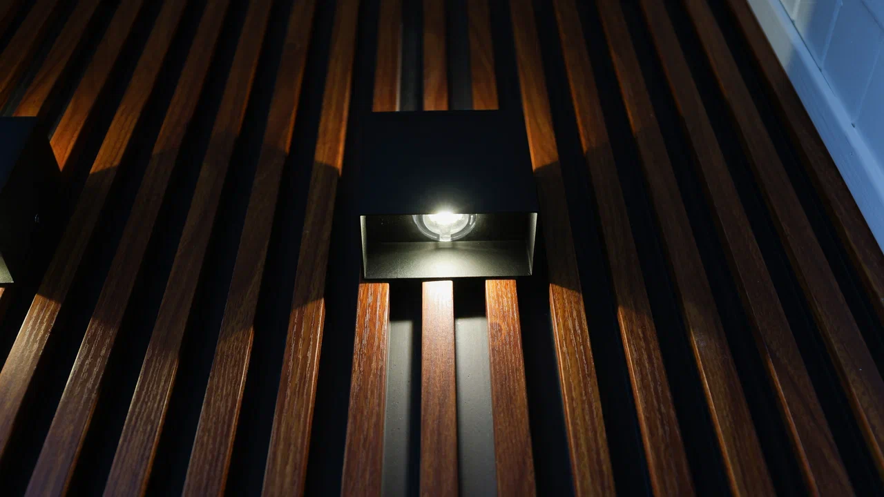 Комбинированная отделка: стены - рейки, ламинат, стеновой паркет, пол - плитка, потолок - ламинат.