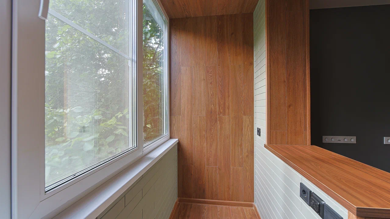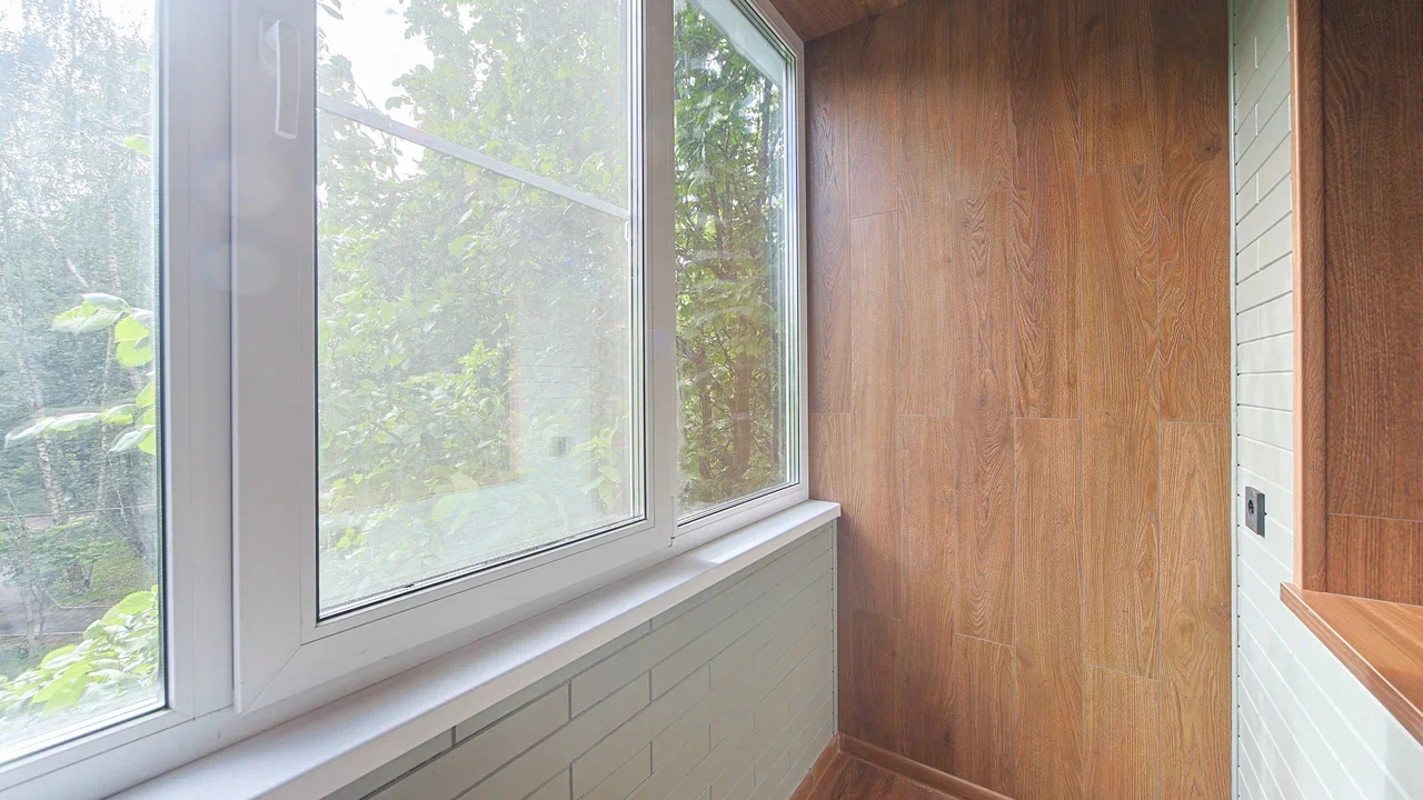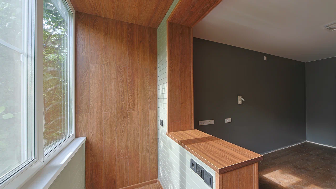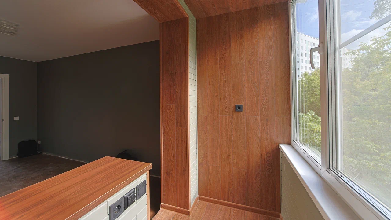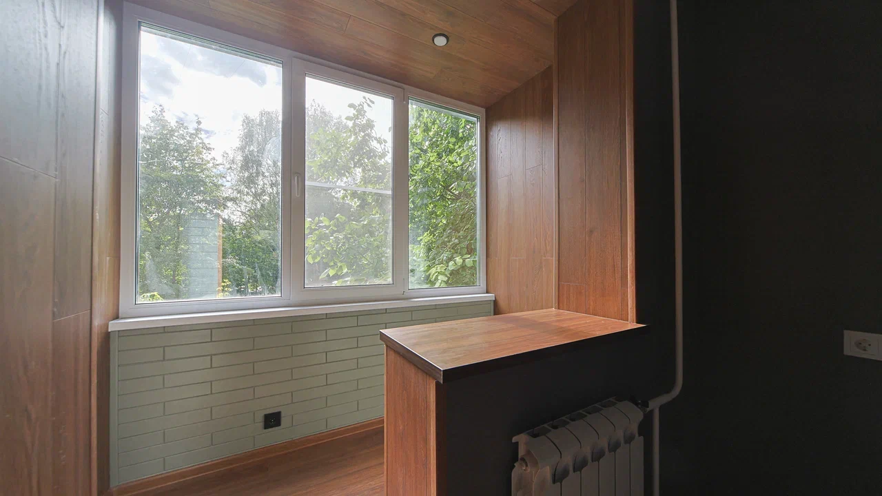 Обшивка: Комбинированная облицовка различными видами материала: стеновой паркет и ламинат. Остекление: Профильная система Rehau Grazio 70 с качественной немецкой фурнитурой Roto обеспечивает герметичность и долговечность конструкции. Электрика: Полностью выведены электрические сети, установлены осветительные приборы. Для дополнительного комфорта установлено напольное покрытие с функцией подогрева — теплый пол инфракрасного типа.Заказчик высоко оценил проделанные работы и остался доволен результатом. Дизайнерская концепция оформления позволила создать комфортную зону отдыха на лоджии площадью 3 м².