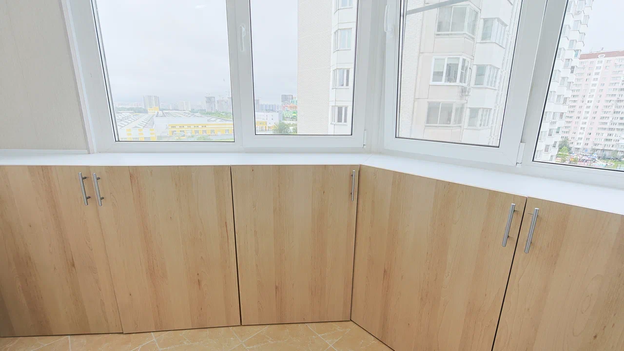 Оригинальное решение: встроенные шкафы под подоконник..Сроки: 1 день-демонта/монтаж окон, 5 дней - обшивка балкона.