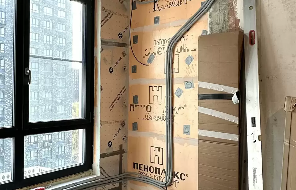 Основной задачей стало создание тёплого пространства, присоединённого к комнате, с надёжной защитой от сильного продувания вентилируемого фасада. Стена со стороны фасада была утеплена в два слоя: использованы пеноплекс и PIR-панели, что позволило исключить мостики холода и обеспечить необходимую теплоизоляцию. Потолок также утеплён PIR-панелями, а все стыки и примыкания тщательно герметизированы.