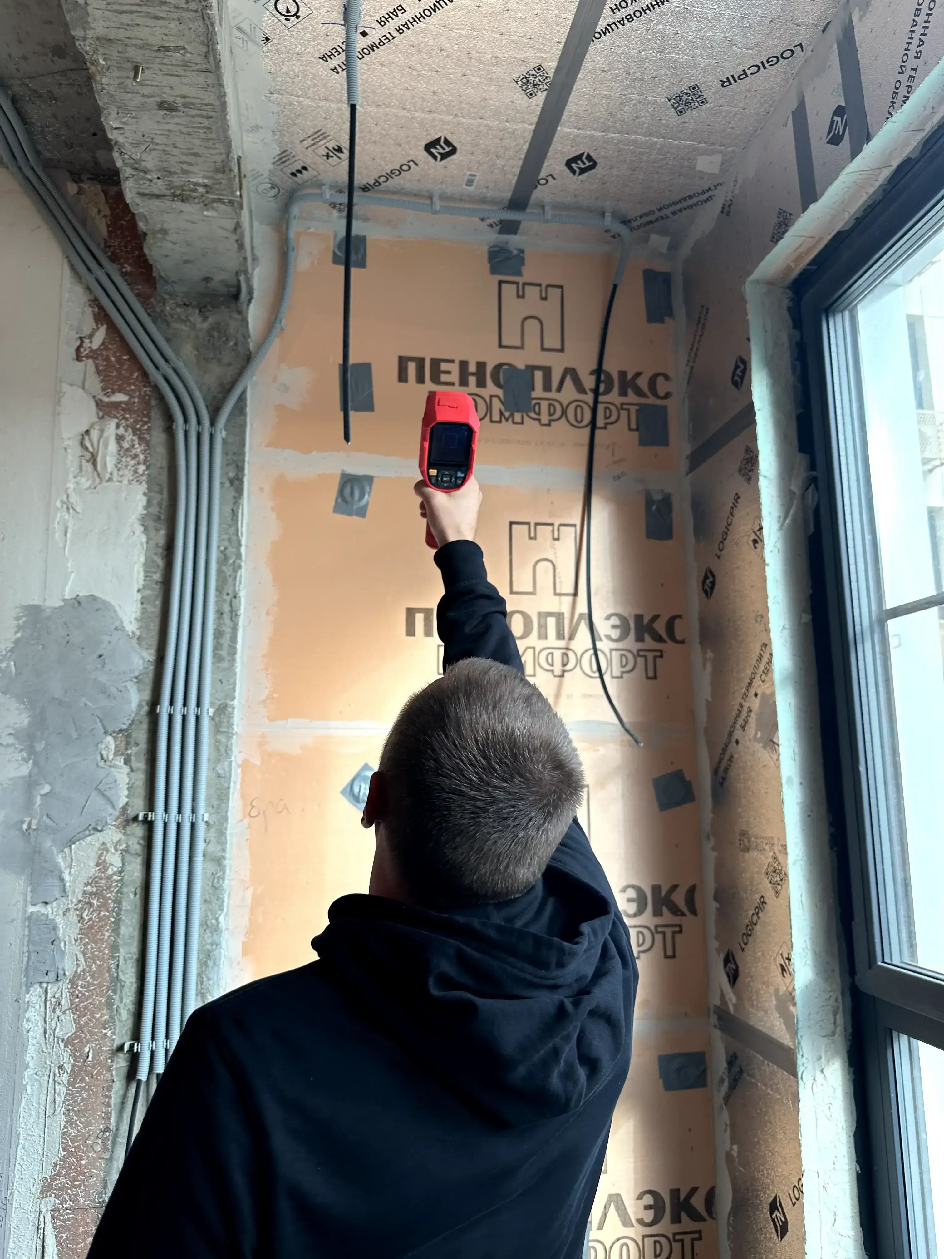 После завершения работ была проведена проверка тепловизором. Температура по поверхности пеноплекса составила около 21,7–22 °C, тогда как бетонные стены дома показали примерно 19,5 °C. Это наглядно подтвердило эффективность системы: утеплённые конструкции лоджии стали теплее основных стен здания.